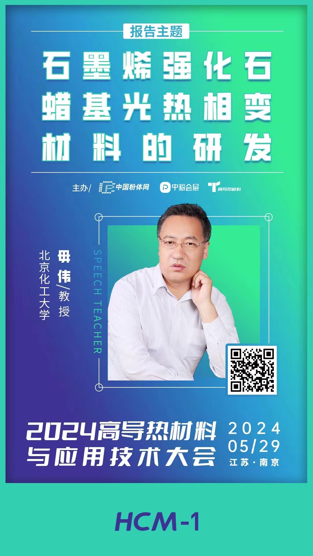 2024年5月29日,中國粉體網將在南京舉辦2024高導熱材料與應用技術大會,大會組委會有幸邀請到毋偉教授為大會作題為《石墨烯強化石蠟基光熱相變材料的研發》的報告。屆時,毋偉教授將對石墨烯-石蠟相變材料的制備、性能及應用前景進行詳細介紹。