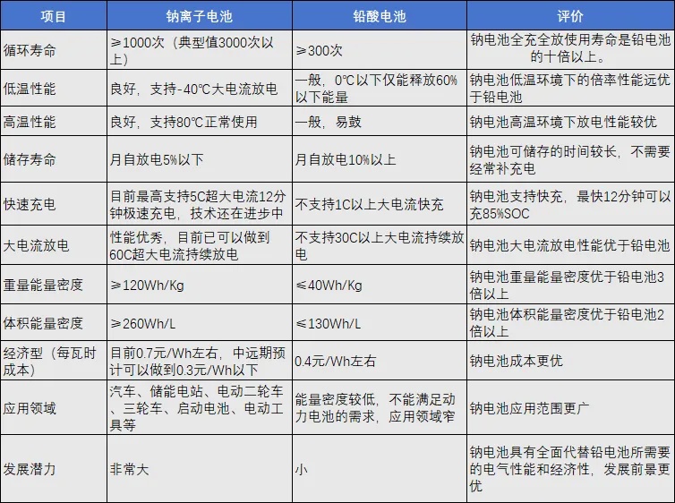鈉離子電池在極寒天氣下不易掉電,且能量密度、工作電壓、循環壽命、輕量化、安全性和環境友好性各方面要顯著高于鉛酸蓄電池,更能滿足車輛的用電需求。