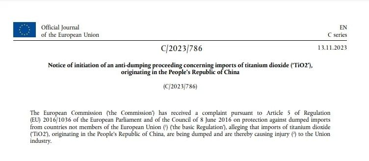2023年11月13日,歐盟在其官網(wǎng)發(fā)布公告,宣布對歐盟自中國進(jìn)口的鈦白粉產(chǎn)品(氧化鈦、二氧化鈦基顏料和制劑Titanium Dioxide,“TiO2”)發(fā)起反傾銷調(diào)查。