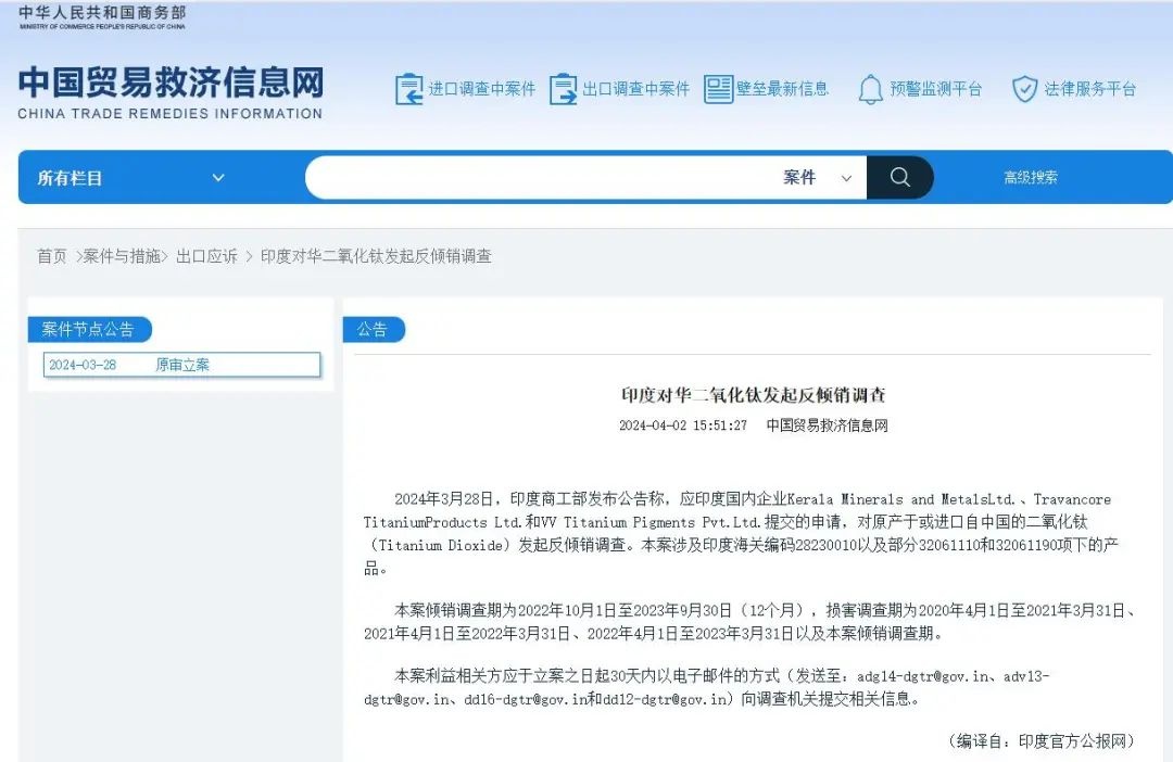 2024年3月28日,印度商工部發(fā)布公告稱,應(yīng)印度主要鈦白粉生產(chǎn)廠家Kerala Mineralsand MetalsLtd.、Travancore Titanium ProductsLtd.和VVTitanium PigmentsPvt.Ltd.提交的申請,對原產(chǎn)于或進(jìn)口自中國的二氧化鈦(Titanium Dioxide)發(fā)起反傾銷調(diào)查。