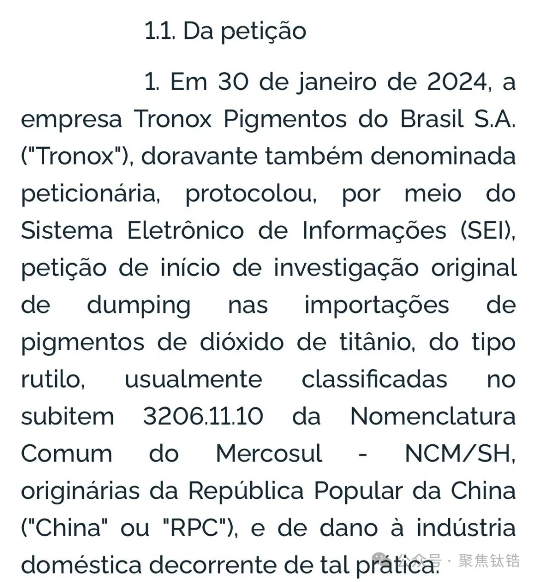 4月30日,巴西發(fā)布2024年第15號公告稱,應(yīng)巴西國內(nèi)企業(yè)Tronox Pigmentosdo BrasilS.A.提交的申請,對原產(chǎn)于中國的金紅石型二氧化鈦發(fā)起反傾銷調(diào)查,涉案產(chǎn)品為金紅石型鈦白粉顏料。