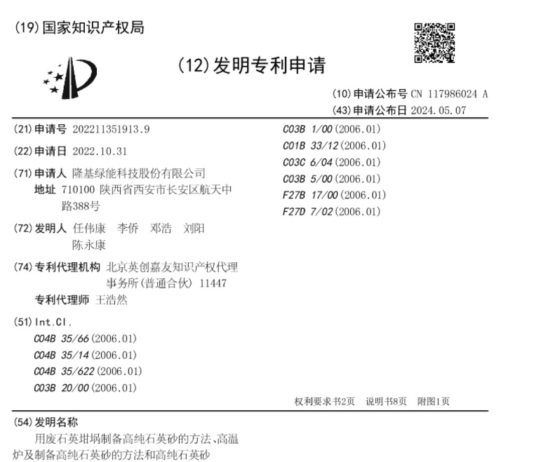 中國粉體網(wǎng)訊 近日,隆基綠能公布了一項(xiàng)國際專利申請,專利名稱為“用廢石英坩堝制備高純石英砂的方法、高溫爐及制備高純石英砂的方法和高純石英砂”,專利申請?zhí)枮镻CT/CN2023/124583。