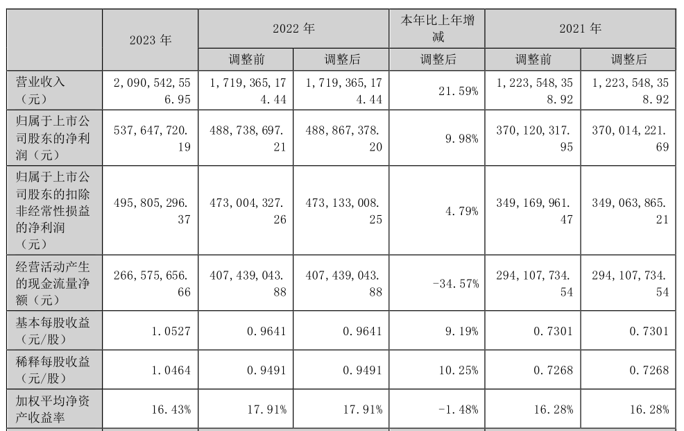 公司此前披露的2023年年報(bào)顯示,公司2023年實(shí)現(xiàn)營(yíng)業(yè)收入20.91億元,同比增長(zhǎng)21.59%;實(shí)現(xiàn)歸屬于上市公司股東的凈利潤(rùn)5.38億元,同比增長(zhǎng)9.98%。