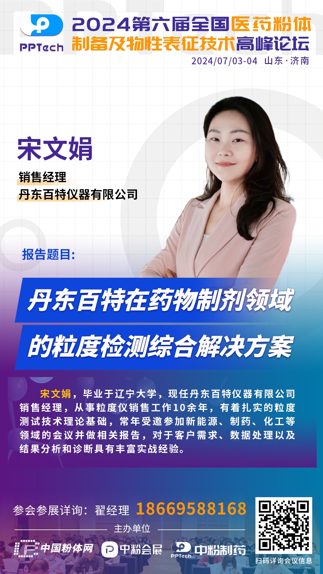 2024年7月3-4日,中國粉體網以“從粉體技術,論制藥工藝”為主題,將在山東的濟南中海凱驪酒店舉辦“第六屆全國醫藥粉體制備及物性表征技術高峰論壇”,屆時來自丹東百特儀器有限公司的宋文娟銷售經理將作《丹東百特在藥物制劑領域的粒度檢測綜合解決方案》報告,報告主講人將圍繞“藥典”“方法開發和驗證”“數據比對”等幾個關鍵詞,深度解析不同制劑對顆粒檢測的要求和解決方案。