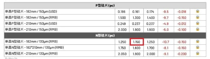n-182硅片:1.15~1.25元/片,均價1.25元/片,一周跌幅10.7%;
