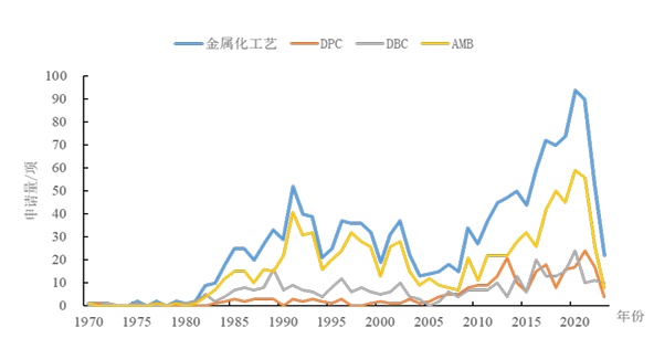 從專利申請可以看出,AMB工藝發展趨勢可分為三個階段:萌芽期、第一發展階段和第二發展階段。