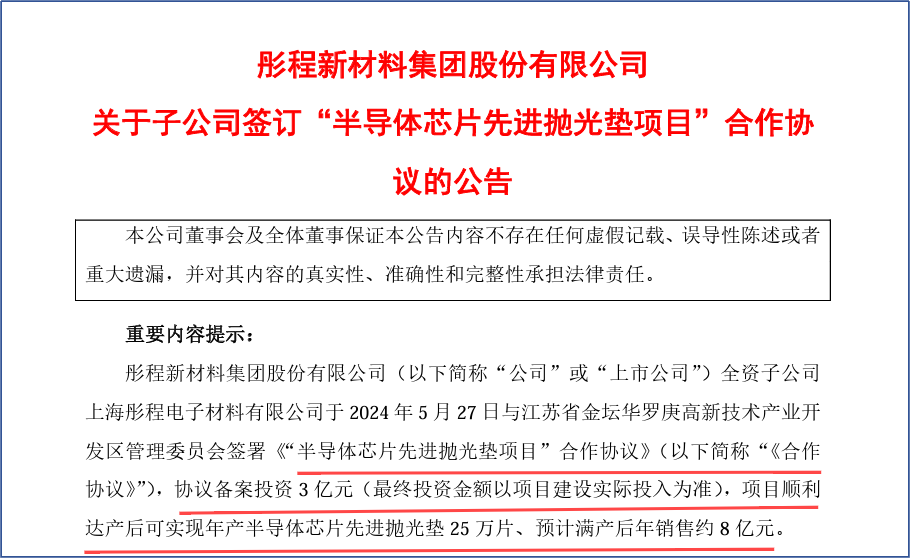 公告顯示,本次投資將進一步推進公司在半導體材料領域的業務拓展和戰略布局,擴展彤程電子作為電子化學品平臺公司的產品廣度,半導體芯片先進拋光墊作為半導體制程中重要的材料之一,具有廣闊的市場規模,目前在研產品性能體現出較強的技術領先性,產品量產后可為公司提供新的業務增長點,持續提高公司盈利能力。
