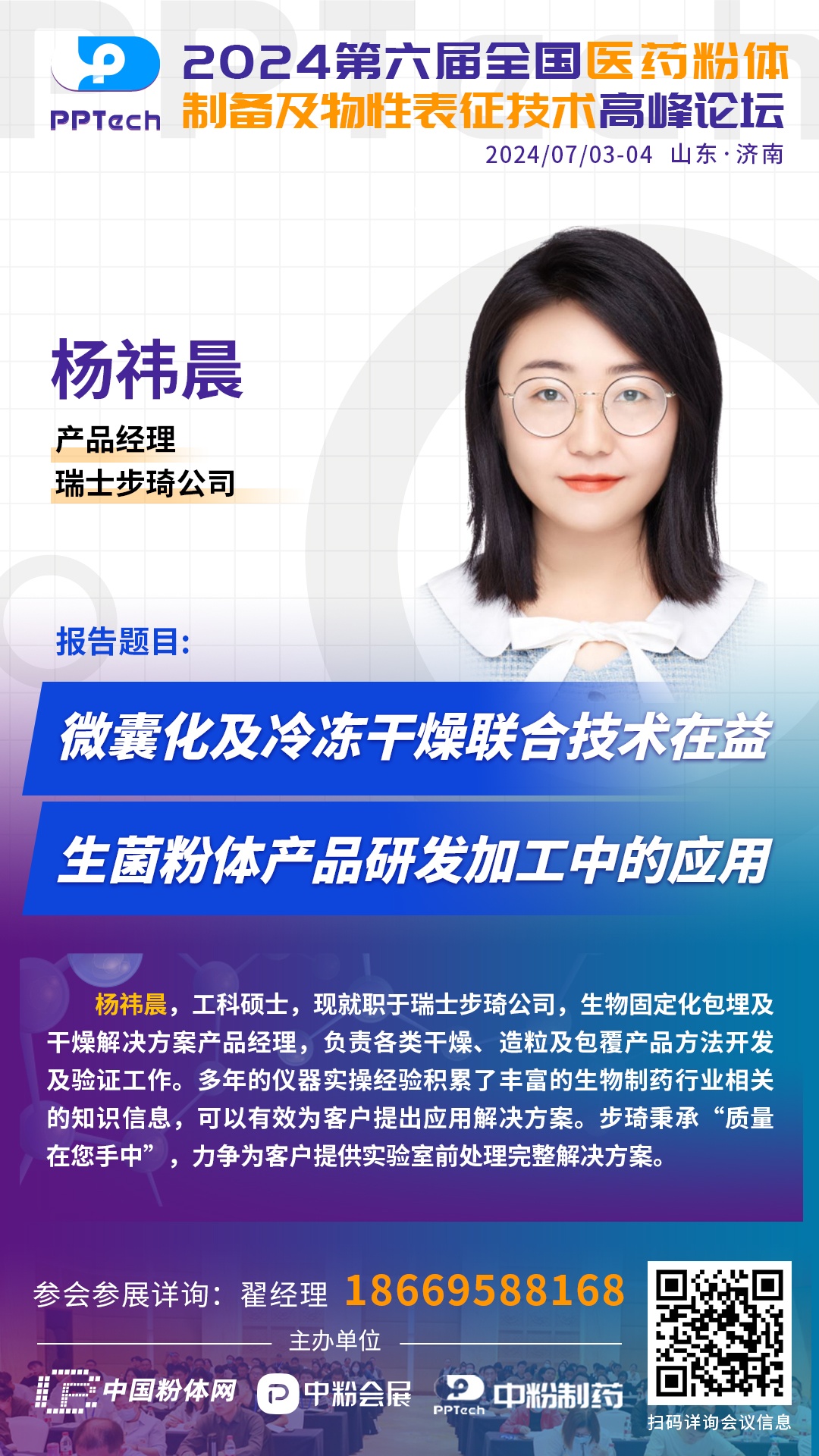 楊祎晨,工科碩士,現就職于瑞士步琦公司,生物固定化包埋及干燥解決方案產品經理,負責各類干燥、造粒及包覆產品方法開發及驗證工作。多年的儀器實操經驗積累了豐富的生物制藥行業相關的知識信息,可以有效為客戶提出應用解決方案。