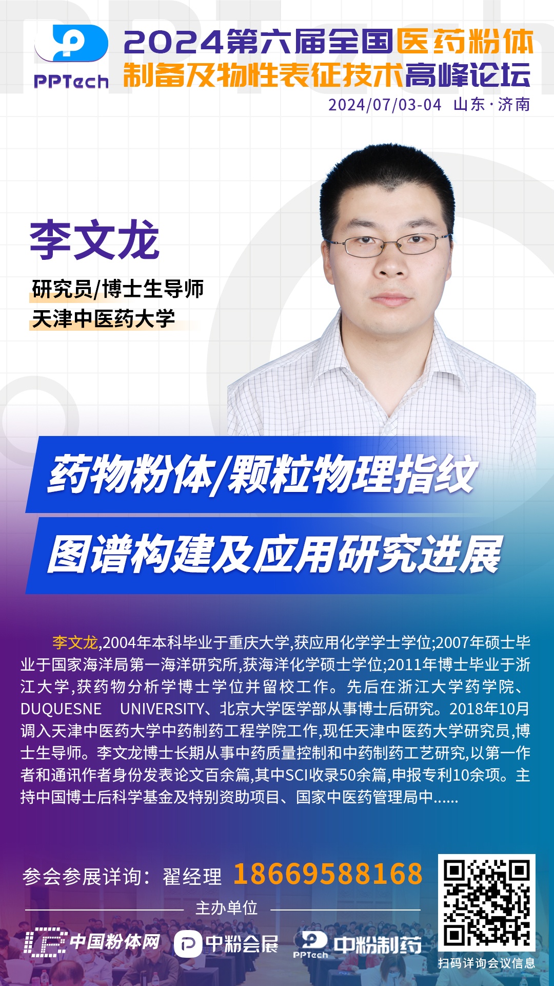 2024年7月3-4日,中國(guó)粉體網(wǎng)以“從粉體技術(shù),論制藥工藝”為主題,將在山東的濟(jì)南中海凱驪酒店舉辦“第六屆全國(guó)醫(yī)藥粉體制備及物性表征技術(shù)高峰論壇”,屆時(shí)來(lái)自天津中醫(yī)藥大學(xué)的李文龍研究員將作《藥物粉體/顆粒物理指紋圖譜構(gòu)建及應(yīng)用研究進(jìn)展》報(bào)告,報(bào)告主講人將為我們介紹中藥粉體物理指紋圖譜轉(zhuǎn)化研究,物理指紋圖譜在中藥粉體、藥用輔料質(zhì)量一致性評(píng)價(jià)和制劑處方設(shè)計(jì)中的應(yīng)用以及未來(lái)的研究方向。