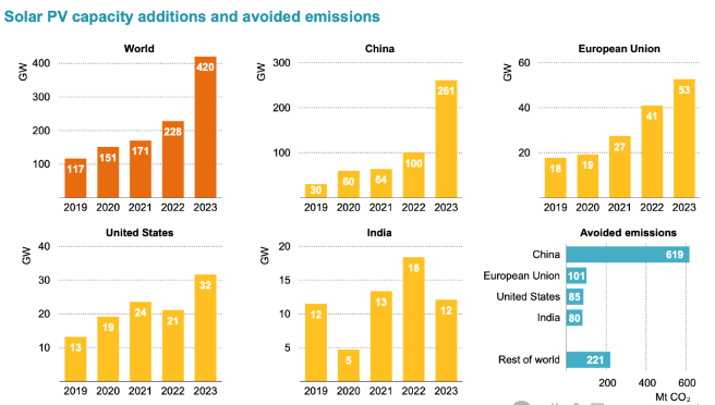 根據IEA的數據,2023年全球光伏裝機容量達到420GW,其中261GW新增裝機容量部署在中國,其次是歐盟(53GW)、美國(32GW)和印度(12GW)。