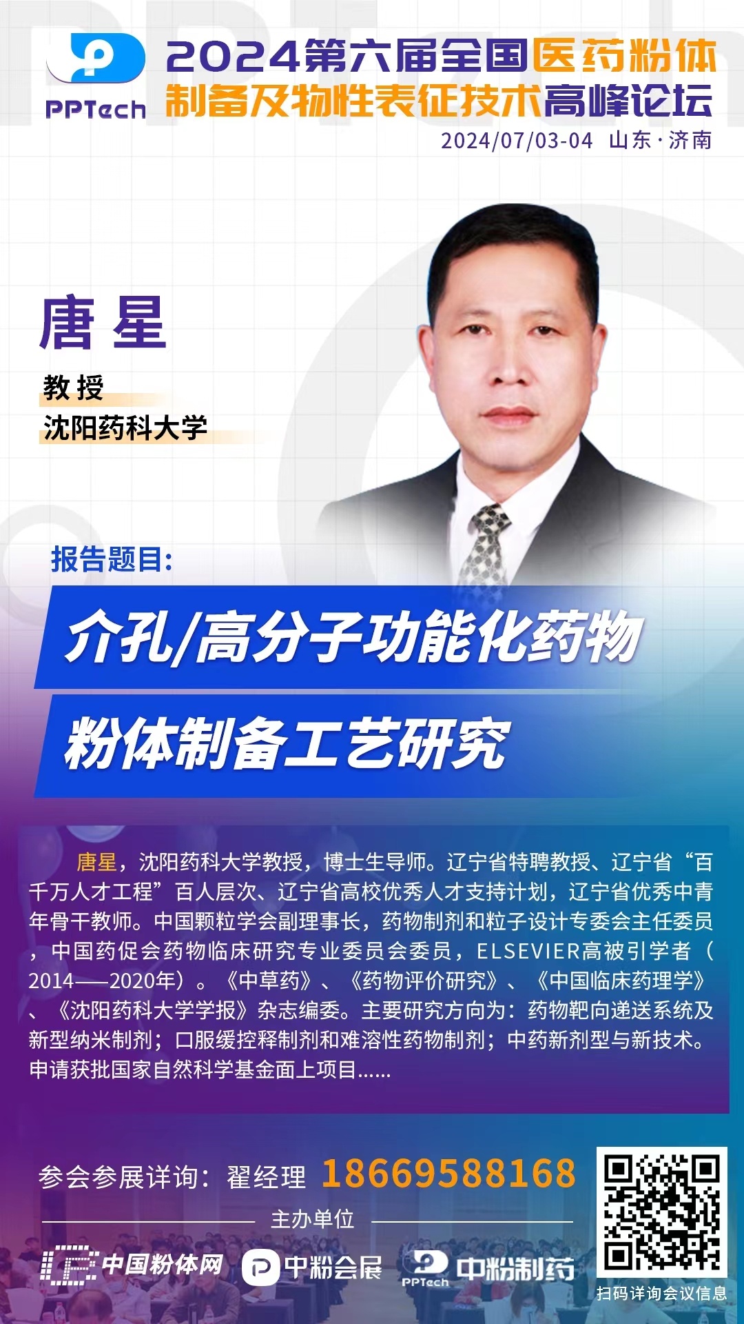 2024年7月3-4日,中國粉體網以“從粉體技術,論制藥工藝”為主題,將在山東的濟南中海凱驪酒店舉辦“第六屆全國醫藥粉體制備及物性表征技術高峰論壇”,屆時來自沈陽藥科大學唐星教授將作《介孔/高分子功能化藥物粉體制備工藝研究》報告,報告主講人將詳述介孔/高分子功能化粉體設計策略,并通過具體工藝實例詳解報告主題。