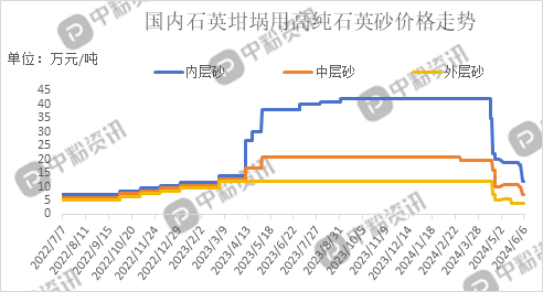 眾所周知,高純石英砂是采用天然水晶或優質天然石英石,經過精挑細選、精細加工而成,是石英坩堝核心原材料,石英坩堝是硅片生產的關鍵耗材。2024年5月中旬開始,國內高純石英砂市場成交回歸冷淡,主要原因為坩堝需求的降低以及價格下降帶來的壓制。