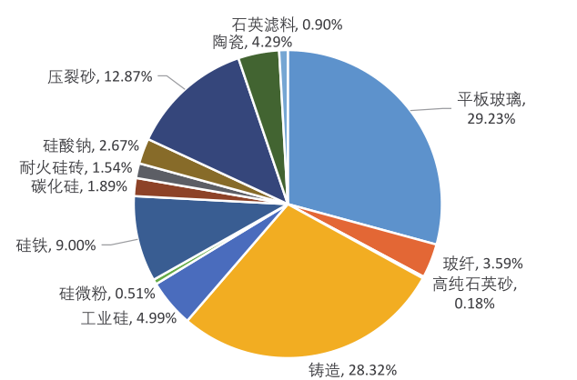 2021年中國(guó)不同領(lǐng)域石英砂產(chǎn)量分布