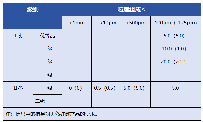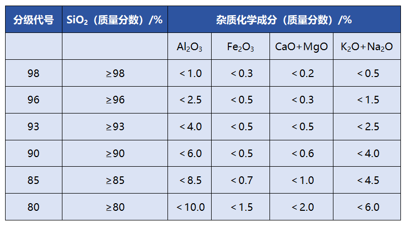 行業(yè)標(biāo)準(zhǔn)《JC/T 529-2000 平板玻璃用硅質(zhì)原料》中有關(guān)平板玻璃用石英砂的化學(xué)成分、粒度組成等指標(biāo)要求如下: