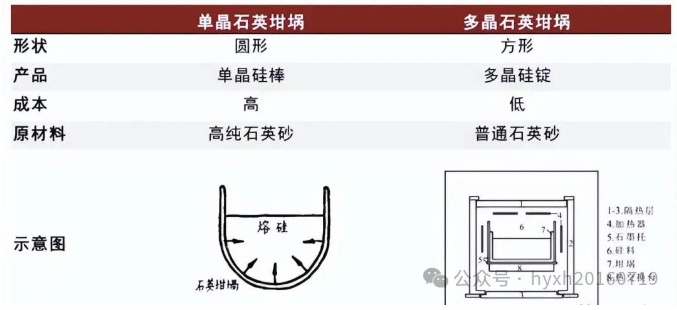半導(dǎo)體石英坩堝主要用于生長(zhǎng)半導(dǎo)體單晶硅,用于制造集成電路、微電子器件等;光伏石英坩堝主要用于生長(zhǎng)光伏單晶硅,用于制造太陽(yáng)能電池、光伏組件等。