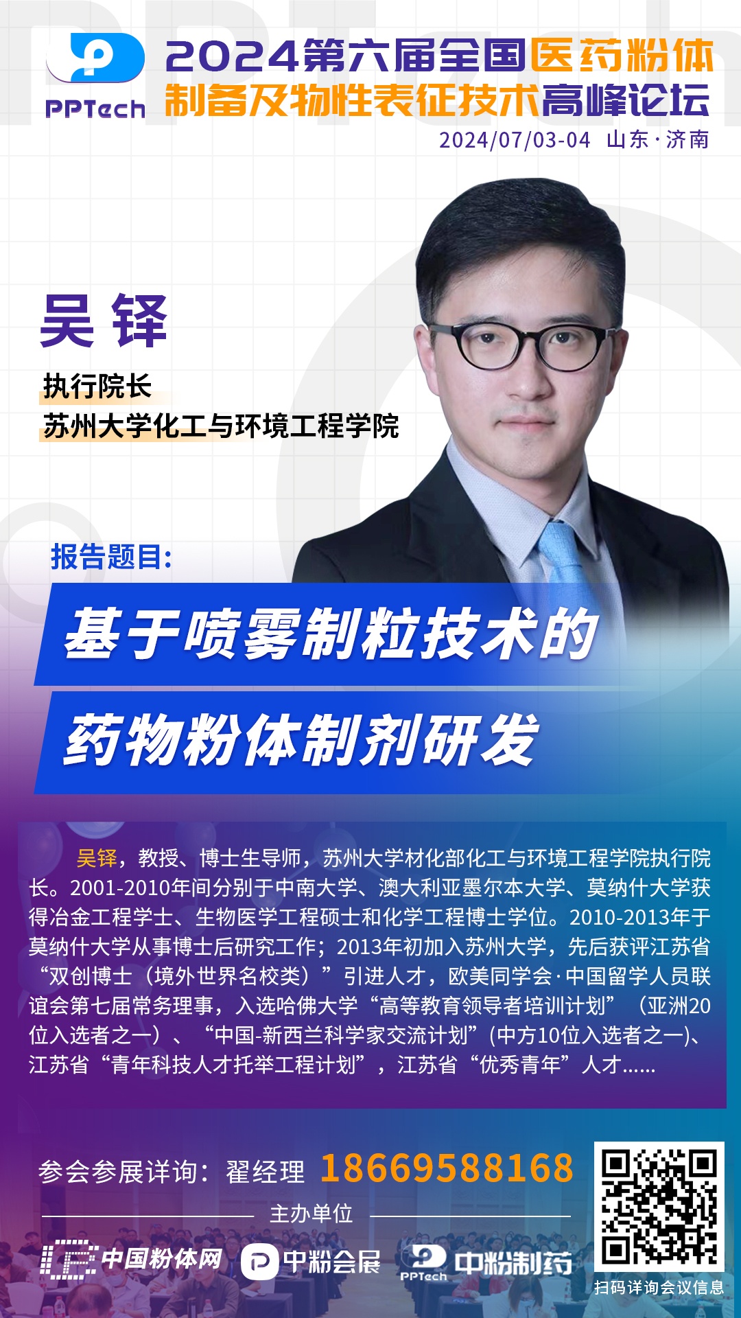2024年7月3-4日,中國粉體網以“從粉體技術,論制藥工藝”為主題,將在山東的濟南中海凱驪酒店舉辦“第六屆全國醫藥粉體制備及物性表征技術高峰論壇”,屆時來自蘇州大學化工與環境工程學院執行院長吳鐸將為大家帶來《基于噴霧制粒技術的藥物粉體制劑研發》的主題報告。