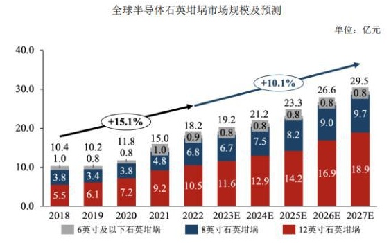 在半導體石英坩堝領域,國外半導體產業逐漸轉移至國內,隨著新能源車、智能電網、自動駕駛、人工智能的發展,8 英寸及 12 英寸半導體硅片出貨量持續增長,我國半導體硅片供應商開始加碼大硅片產能布局,對半導體石英坩堝的需求持續增加,預計至 2027 年,全球半導體石英坩堝市場規模將擴大至 29.5 億人民幣,期間年復合增長率為 10.1%。目前,國內個別企業開展了 32 英寸半導體級石英坩堝的研發工作并具備量產能力。