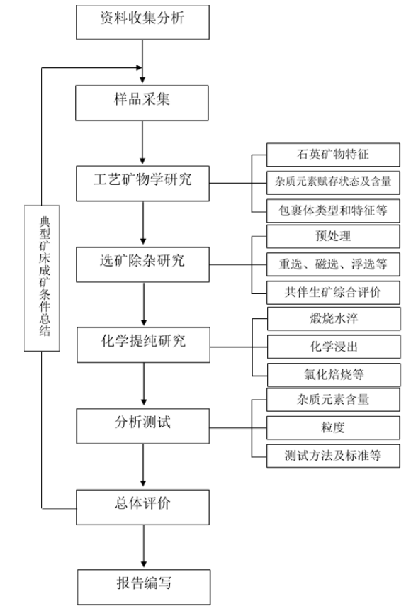 高純石英用硅質原料評價工作通常采用資料收集分析、樣品采集、工藝礦物學研究、選礦除雜研究、化學提純研究、分析測試、總體評價、報告編寫的步驟開展評價工作。