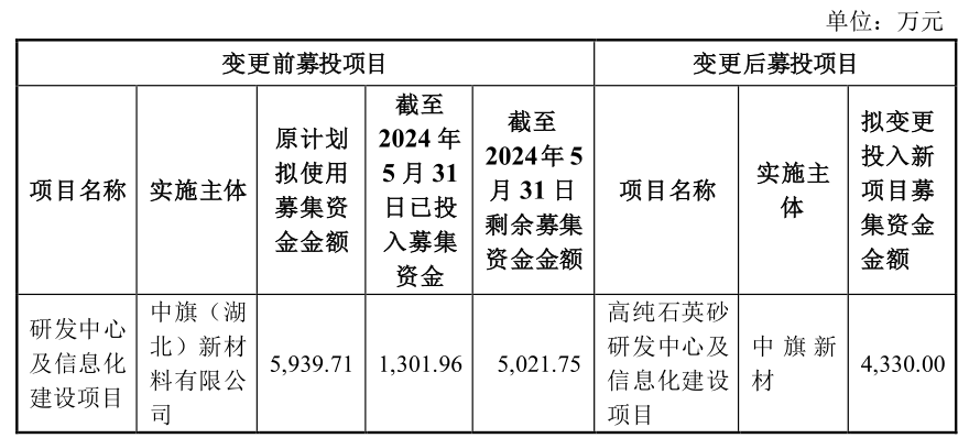 中國粉體網訊 近日,中旗新材發布公告,公司擬將首發募集資金投資項目“研發中心及信息化建設項目”剩余的募集資金用途變更為“高純石英砂研發中心及信息化建設項目”。本次變更的募集資金金額為4330萬元。