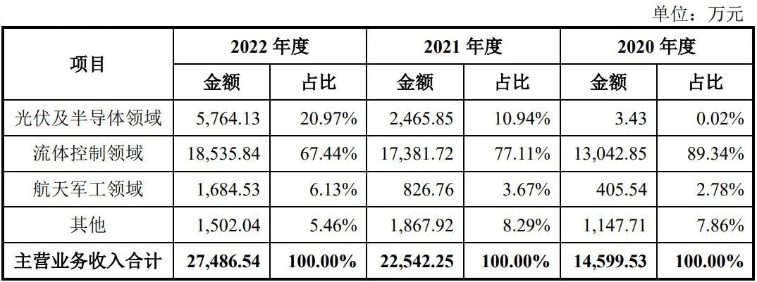 伏爾肯是國內先進的碳化硅、碳化硼陶瓷材料及制品生產商,專注于碳化硅、碳化硼材料及制品的研發生產,掌握了碳化硅陶瓷從材料配方到制品的全套技術工藝,公司產品覆蓋光伏及半導體、流體控制、航天航空等三大領域。在伏爾肯的主營業務收入中,流體控制領域是第一大業務板塊,其收入占總體營收比重分別為89%、77%、67%。