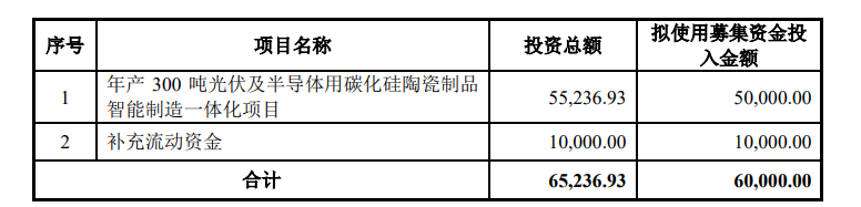 招股書披露,發行人本次擬募集資金6億元,其中5億元用于年產300噸光伏及半導體用碳化硅陶瓷制品智能制造一體化項目,1億元用于補充流動資金。
