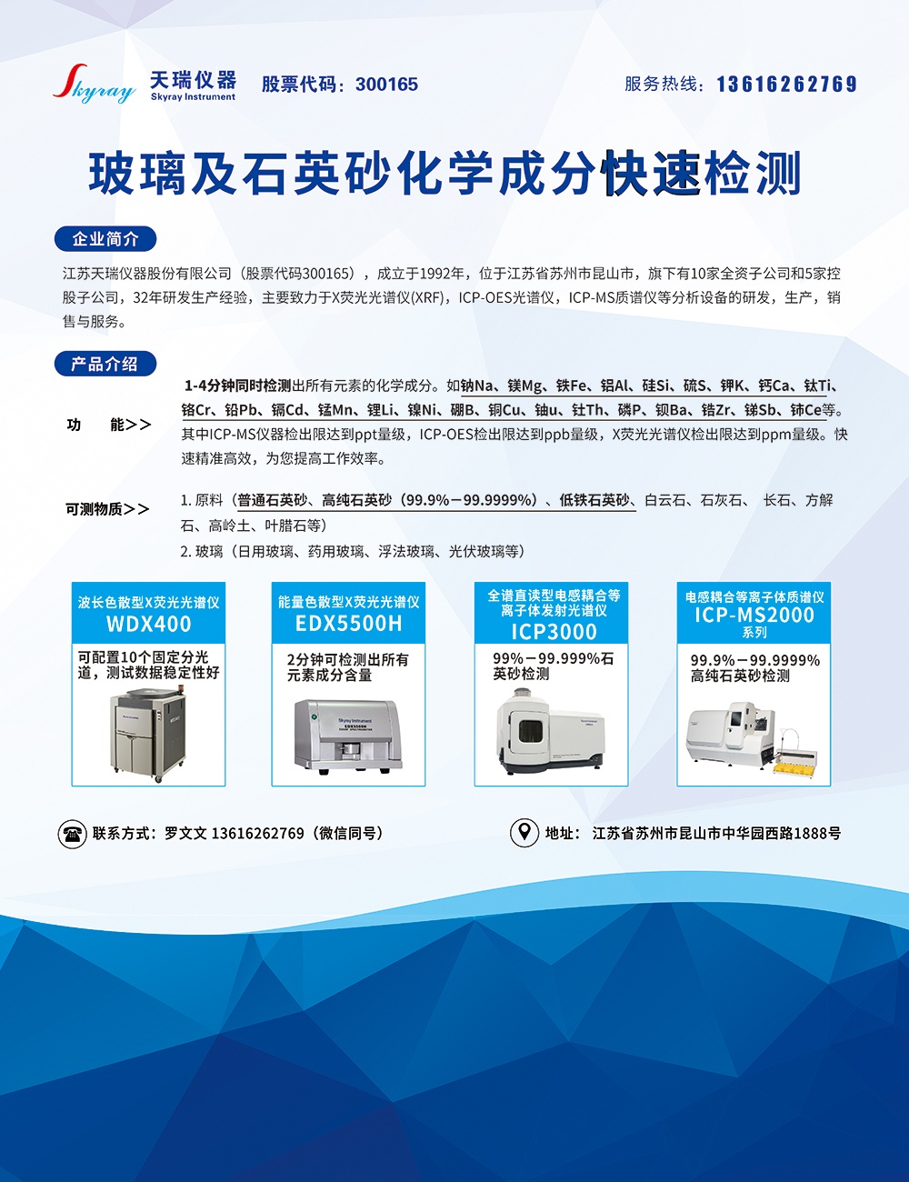 江蘇天瑞儀器股份有限公司是具有自主知識產權的高科技企業,注冊資本49551.1725萬。旗下擁有蘇州天瑞環境科技有限公司、北京邦鑫偉業技術開發有限公司、上海貝西生物科技有限公司、天瑞環境科技(仙桃)有限公司、四川天瑞環境科技有限公司、河南省天瑞環境科技有限公司、廈門質譜儀器儀表有限公司、蘇州智慧天瑞環保科技有限公司、湖北天之瑞智海創新研究院有限公司九家全資子公司和江蘇國測檢測技術有限公司、上海磐合科學儀器股份有限公司、沁水璟盛生活垃圾全資源化有限公司、雅安天瑞水務有限公司、安岳天瑞水務有限公司五家控股子公司。總部位于風景秀麗的江蘇省昆山市陽澄湖畔。公司專業從事光譜、色譜、質譜等分析測試儀器及其軟件的研發、生產和銷售。
