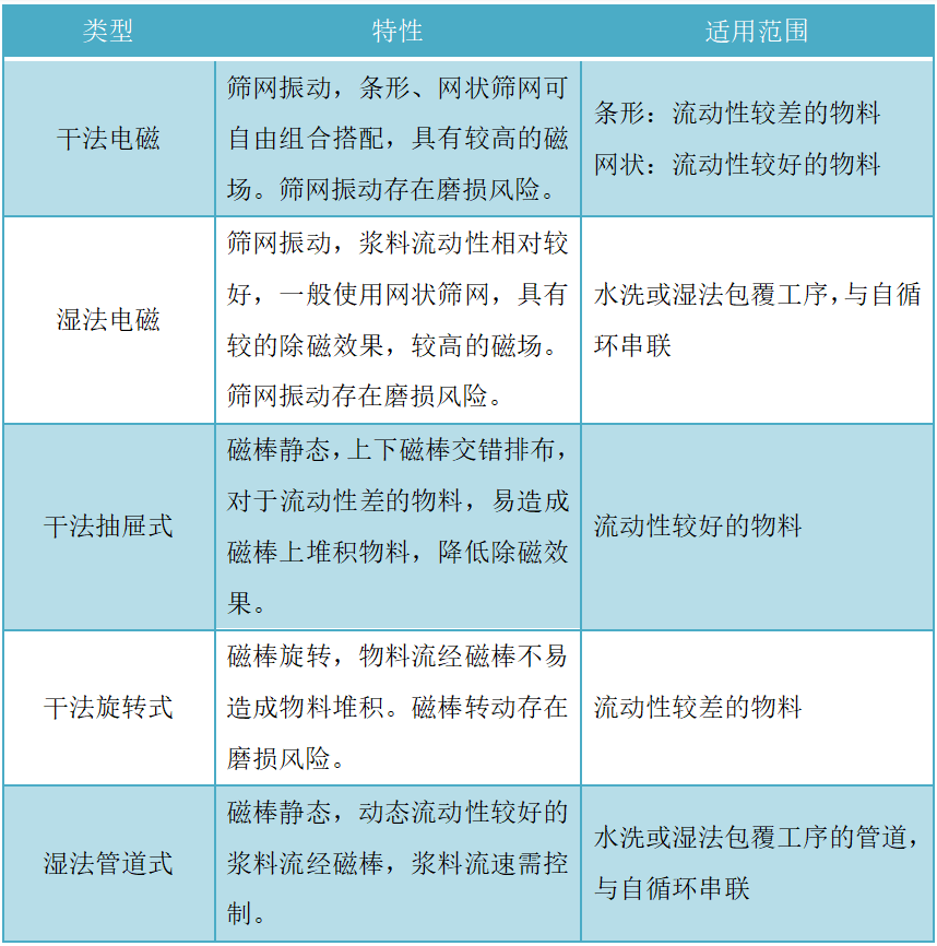 針對不同的工序,使用到的除鐵器類型有干法抽屜式、干法旋轉式、濕法管道式等。