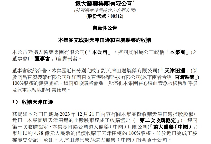 2023年12月,遠(yuǎn)大醫(yī)藥發(fā)布公告宣布與日本田邊三菱制藥株式會(huì)社簽訂股權(quán)收購(gòu)協(xié)議,以港幣4.0億元(約人民幣3.68億元)收購(gòu)天津田邊制藥有限公司75.35%的股權(quán)。今年5月,力生制藥發(fā)布公告宣布,擬按照不低于1.2億元的底價(jià)公開掛牌轉(zhuǎn)讓所持天津田邊24.65%的股權(quán)。最終,遠(yuǎn)大醫(yī)藥以1.2億元的底價(jià)拿下所有股份。連同第一次收購(gòu)協(xié)定,遠(yuǎn)大醫(yī)藥累計(jì)以約4.88億元人民幣的代價(jià)收購(gòu)了天津田邊的100%股權(quán),并于近日完成了股權(quán)變更登記。至此,天津田邊已成為遠(yuǎn)大醫(yī)藥(中國(guó))的全資子公司。