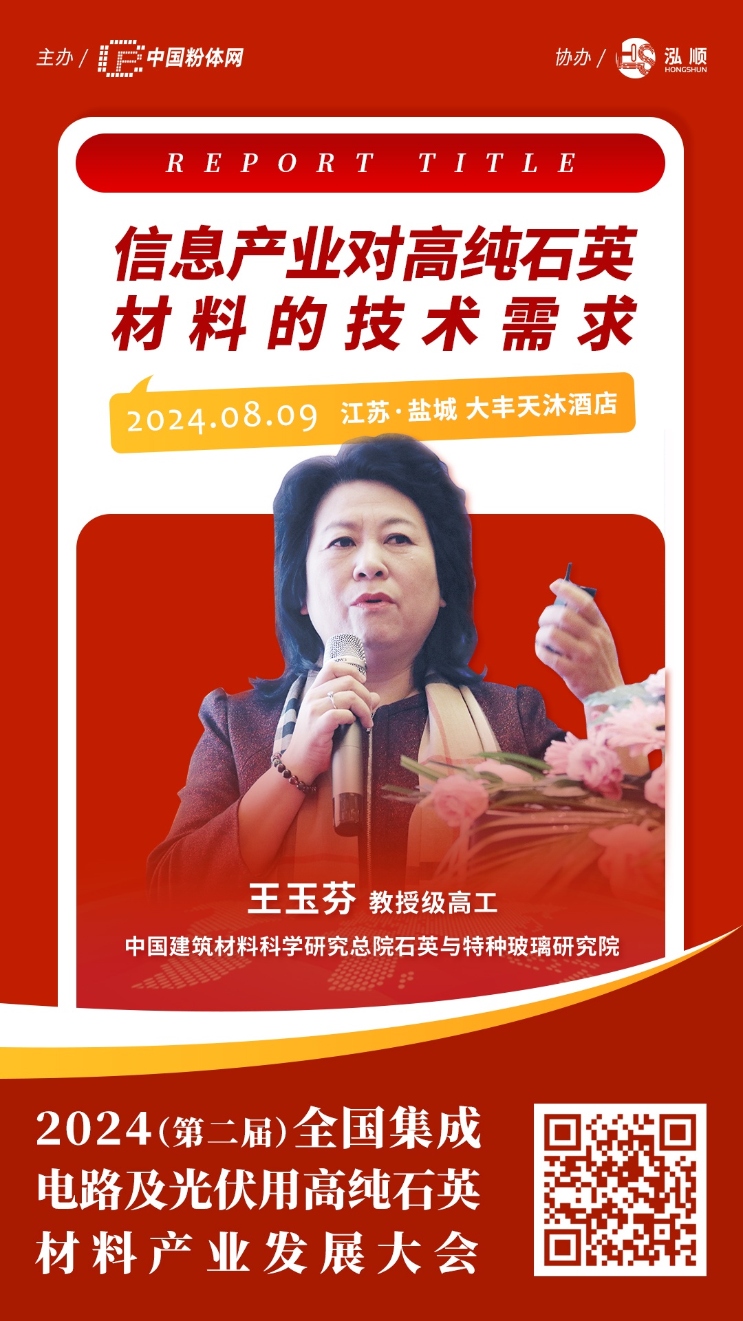 2024年8月9日,中國(guó)粉體網(wǎng)將在江蘇鹽城大豐天沐酒店舉辦“2024(第二屆)全國(guó)集成電路及光伏用高純石英材料產(chǎn)業(yè)發(fā)展大會(huì)”,屆時(shí),來(lái)自中國(guó)建筑材料科學(xué)研究總院石英與特種玻璃研究院的教授級(jí)高工王玉芬將作《信息產(chǎn)業(yè)對(duì)高純石英材料的技術(shù)需求》報(bào)告。