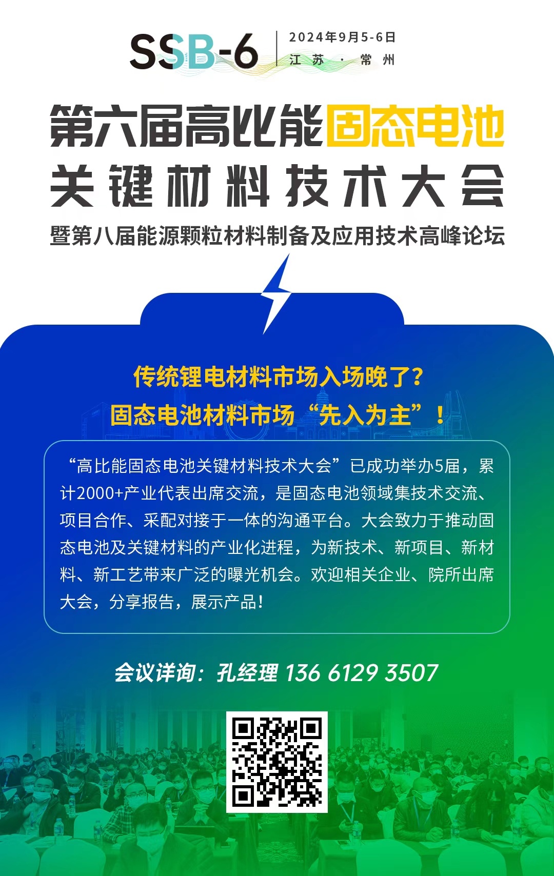 9月5-6日江蘇常州,第六屆高比能固態電池關鍵材料技術大會重磅來襲!CATL/比亞迪/國軒/蜂巢/清陶/贛鋒鋰電/LG/中科固能/合源鋰創/高能時代/濰柴…...業界耳熟能詳的固態電池公司齊聚一堂,共襄盛舉。本次大會是固態電池領域集技術交流,項目合作、采配對接于一體的溝通平臺,在這里,您可以與“行業巨頭”面對面交流,實現供應鏈現場對接!機不可失時不再來,歡迎相關企業、院所出席大會!