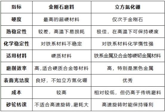 在選擇金剛石磨料和立方氮化硼磨料時,需要考慮工件的材料類型、硬度、是否含有鐵系元素以及砂輪的預期使用轉速等多種因素。金剛石磨料通常適用于非鐵系材料,如硬質合金、玻璃、陶瓷等,而立方氮化硼磨料特別適合鐵系金屬材料的加工,如工具鋼和高速鋼。此外,對于表面光潔度的要求程度以及成本,也是選擇磨料的重要考量因素。金剛石磨料與立方氮化硼磨料的部分指標對比如下: