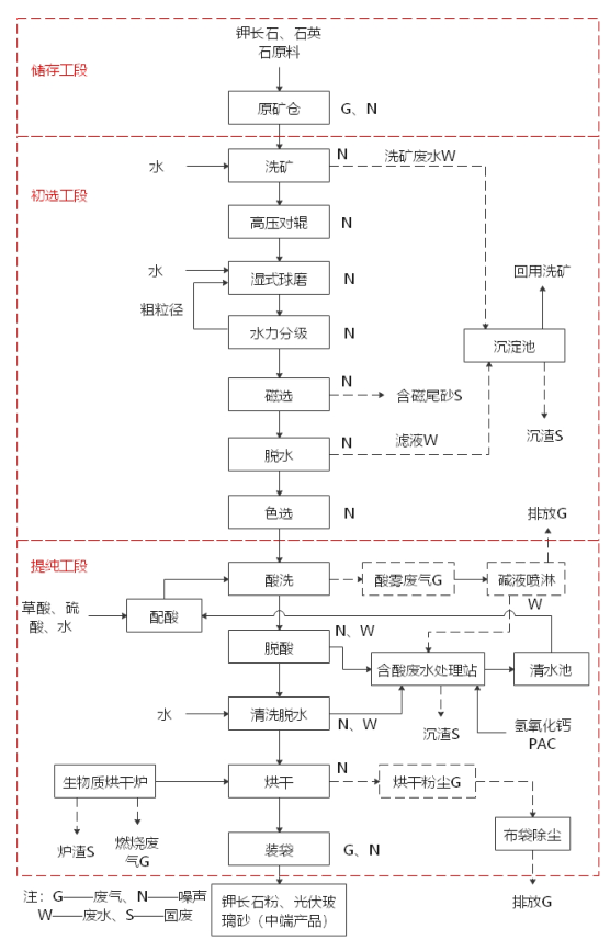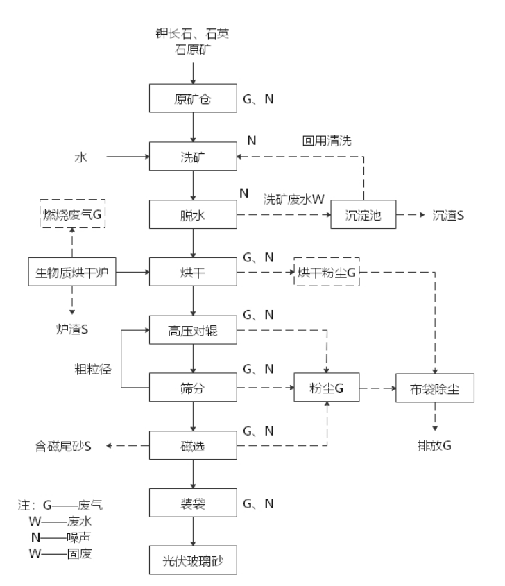 項目總投資20000萬元,外購鉀長石、石英石作為原料,建設4條光伏玻璃砂生產線和2條高白鉀長石粉生產線,生產工藝主要通過清洗、烘干、破碎、磁選、球磨、酸洗等工序得到光伏玻璃砂和鉀長石粉。項目建成后形成年產30萬噸光伏玻璃砂和25萬噸高白鉀長石粉的能力。