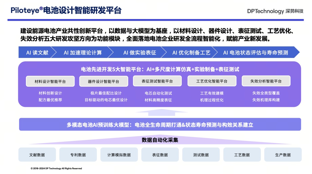 Piloteye®電池設計智能研發(fā)平臺從RDMTA這五個電池研發(fā)的關鍵環(huán)節(jié),基于AI for Science新范式,利用DP系列多尺度建模算法、Uni-Mol分子構(gòu)象大模型、DPA分子模擬大模型、Uni-ELF配方大模型、具有GPU加速與自動微分功能的新一代電化學計算模型、電芯老化模式定量分析算法等一系列人工智能新技術突破電池研發(fā)難點。
