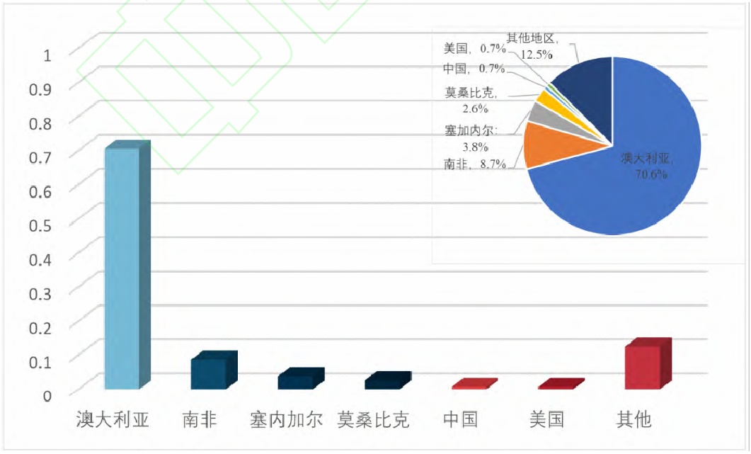 鋯英砂(ZrSiO4)和斜鋯石(ZrO2)是目前最具工業開采價值的含鋯礦物,其中鋯英砂主要賦存于濱海砂礦中,是冶煉金屬鋯的主要來源。澳大利亞是全球鋯英砂最豐富的國家。