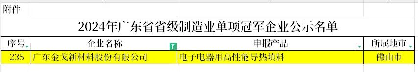 中國粉體網訊 近日,廣東省工業和信息化廳公布了2024年廣東省省級制造業單項冠軍企業通過名單,廣東金戈新材料股份有限公司(以下簡稱金戈新材)依托“電子電器用高性能導熱填料”產品成功入選。