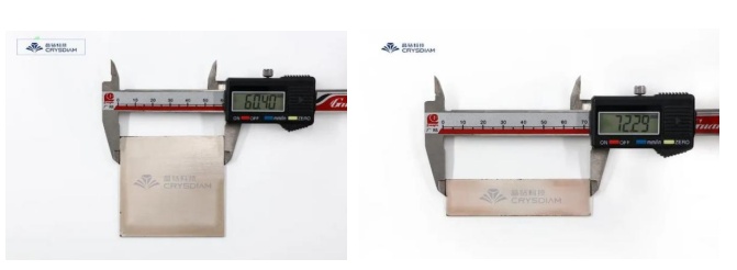 8月1日,寧波晶鉆科技股份有限公司研制出產品尺寸60mm×60mm,長邊尺寸72.29mm CVD大尺寸同質外延金剛石襯底。換算成半導體行業晶圓單位約3.35英寸。這不僅刷新了該企業的記錄,而且也是目前已知全球尺寸最大的一顆人造單晶金剛石。