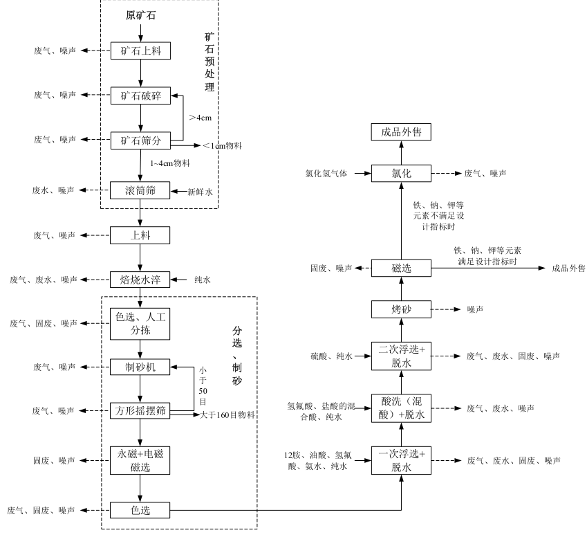 項目廠房內設置原料暫存區、礦石預處理區及石英坩堝試驗線,成品暫存庫、檢驗室、電磁磁選、高溫氯化區、烤砂區、純水制備、儲罐區、酸洗區、浮選區、焙燒水淬及制砂、篩分區等,其中,高純石英硅料(電子級)生產工藝流程為礦石上料、礦石破碎、礦石篩分等預處理工序、焙燒水淬、分選、制砂、除雜、一次浮選、酸洗、二次浮選、烤砂、電磁磁選和氯化包裝等。