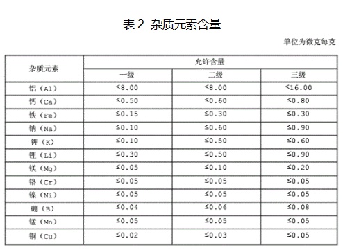 其中,行業標準SJ/T3328-2016電子產品用高純石英砂標準中規定了電子產品的技術條件、分析方法通則、灼燒矢量的測定、二氧化硅的測定、鐵的測定、銅的測定、鉻的測定、鋁的測定以及鉛的測定。標準適用于電子產品用高純石英砂,可用于制造半導體石英器件的管、棒、塊、板、片以及坩堝等器件,標準規定粒徑應在70μm~350μm,二氧化硅含量和雜質元素含量應該符合下列圖表(表1,表2)中要求。