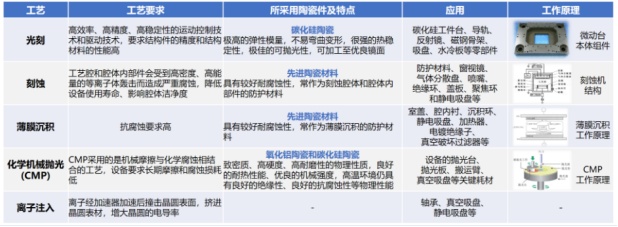 半導體設備中常用的先進陶瓷材料是氧化鋁、氮化鋁、碳化硅、氮化硅、氧化釔等,其中氧化鋁、碳化硅和氮化鋁使用較多。半導體設備由腔室內和腔室外設備組成,陶瓷零部件大部分用在離晶圓更近的腔室內,屬于關鍵零部件,主要應用需求在刻蝕、薄膜沉積、光刻和氧化擴散等設備,氧化鋁、氮化鋁等先進陶瓷經精密加工后制備的半導體設備用核心零部件,具有高強度、耐腐蝕、高精度等優異性能。