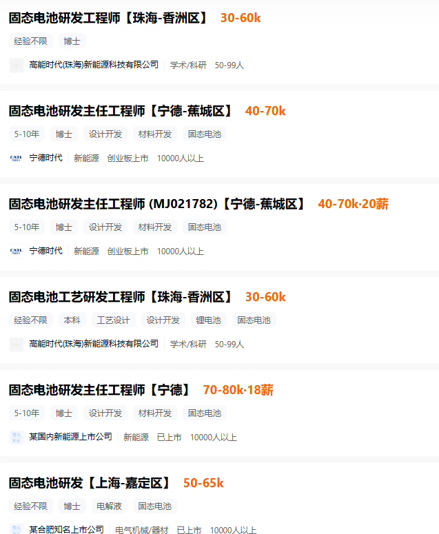 據(jù)了解,寧德時代在招聘固態(tài)電池研發(fā)專家時,開出的工資為100-300萬,且要求具有5年以上固態(tài)電池相關(guān)項目開發(fā)經(jīng)驗,博士以上學(xué)歷,海外博士相關(guān)優(yōu)先。所以高薪和學(xué)歷以及工作經(jīng)驗也是密切相關(guān)的。