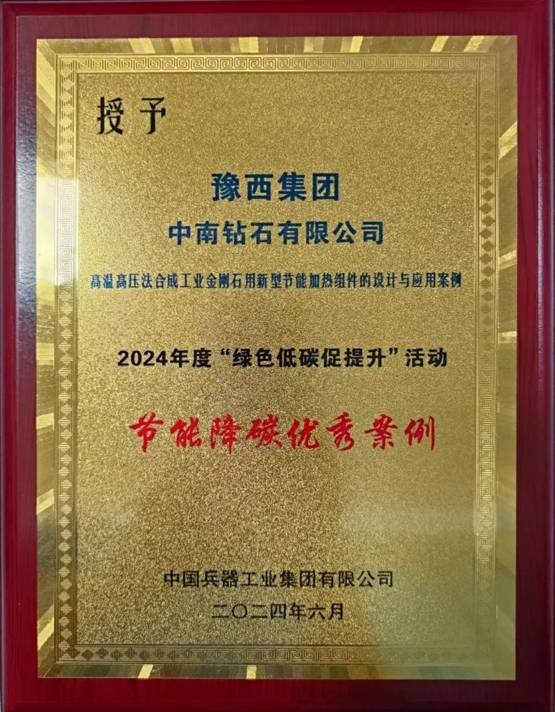 中南鉆石具有較強的科技創新能力及整合創新能力,其中高溫高壓技術位居世界一流水平。2024年6月,中南鉆石有限公司“高溫高壓法合成工業金剛石用新型節能加熱組件的設計與應用”就曾獲評中國兵器工業集團“綠色低碳促提升節能降碳”優秀成果案例。該案例通過設計研發出一種人造金剛石合成用新型節能發熱組件,進一步降低了生產過程中的電能消耗。
