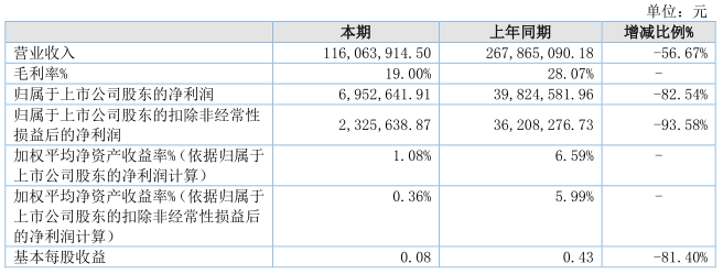 中國粉體網訊 近日,惠豐鉆石發布半年報,報告顯示,公司2024年半年度實現營業收入約1.16億元,同比下降56.67%;歸屬于上市公司股東的凈利潤為695.26萬元,同比下降82.54%;扣除非經常性損益后的凈利潤為232.56萬元,同比下降93.58%。
