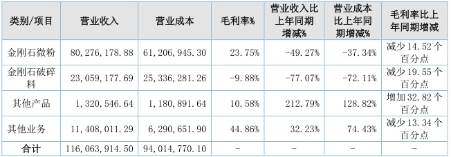 報告顯示,公司主營業務收入包括金剛石微粉、金剛石破碎料、其他產品(研磨液、培育鉆石)等銷售收入是1.046億元,比上年同期下降59.63%。金剛石微粉、金剛石破碎料銷售收入較上年同期分別減少49.27%、77.07%。
