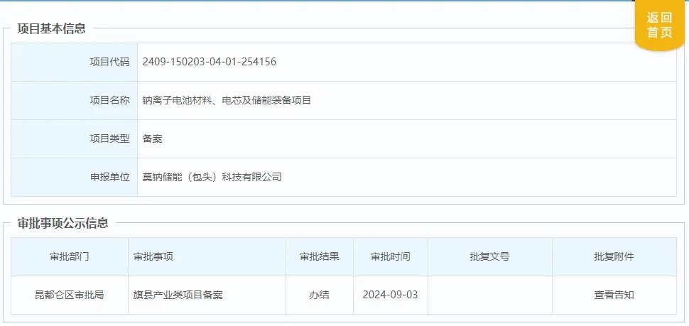 9月3日,內蒙古又一鈉離子電池材料、電芯及儲能裝備項目備案通過。