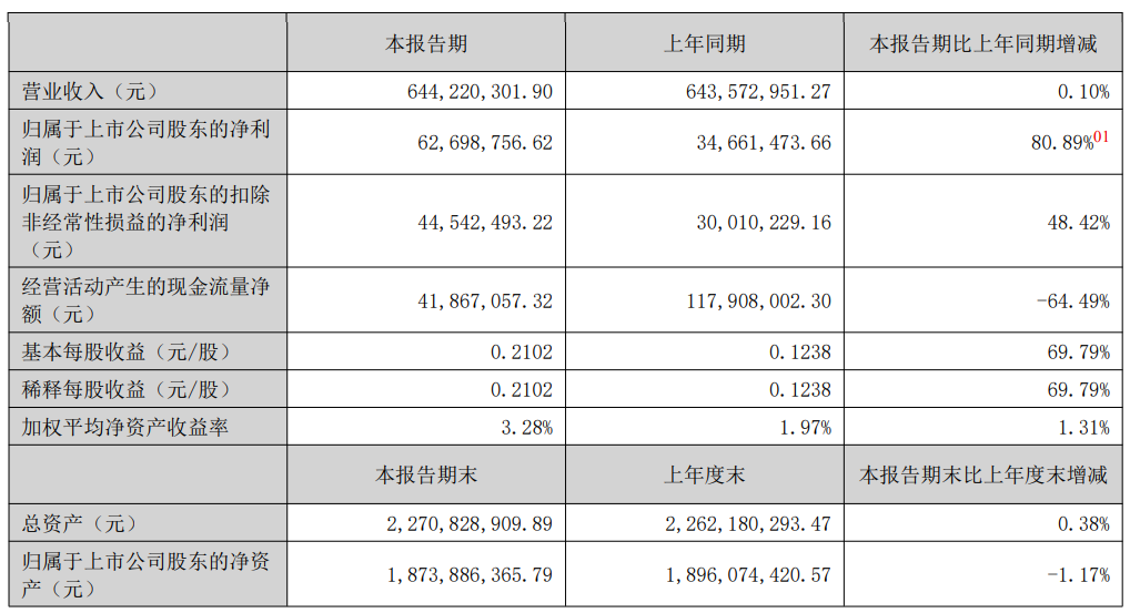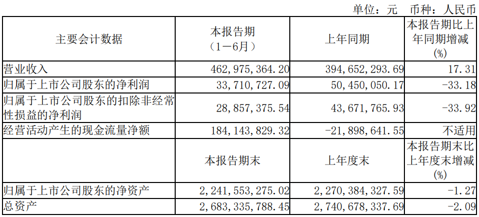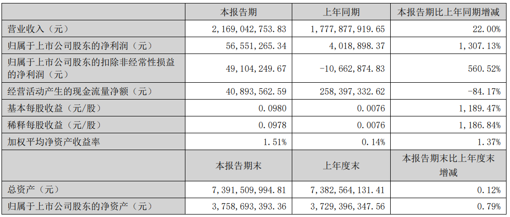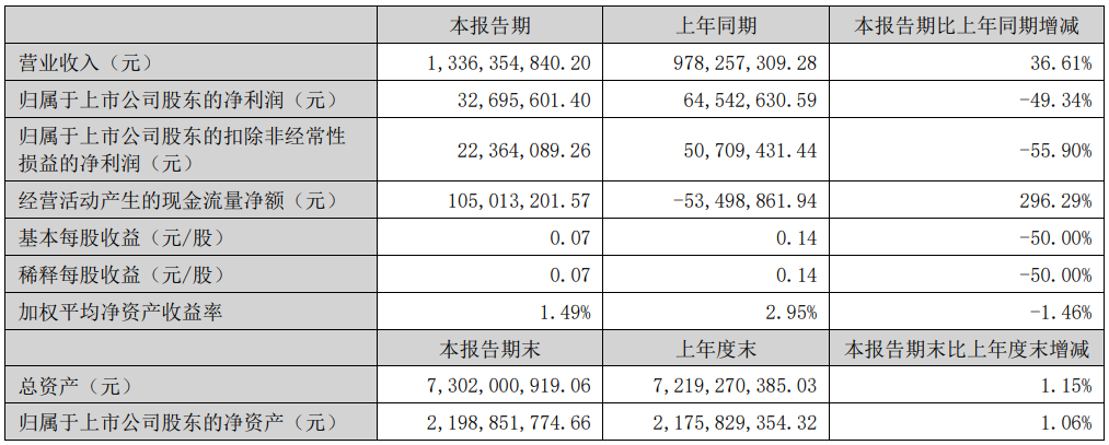 報告期內,公司實現營業總收入13.36 億元,同比上升36.61%,實現歸屬上市公司股東凈利潤0.33億元,同比下降49.34%。