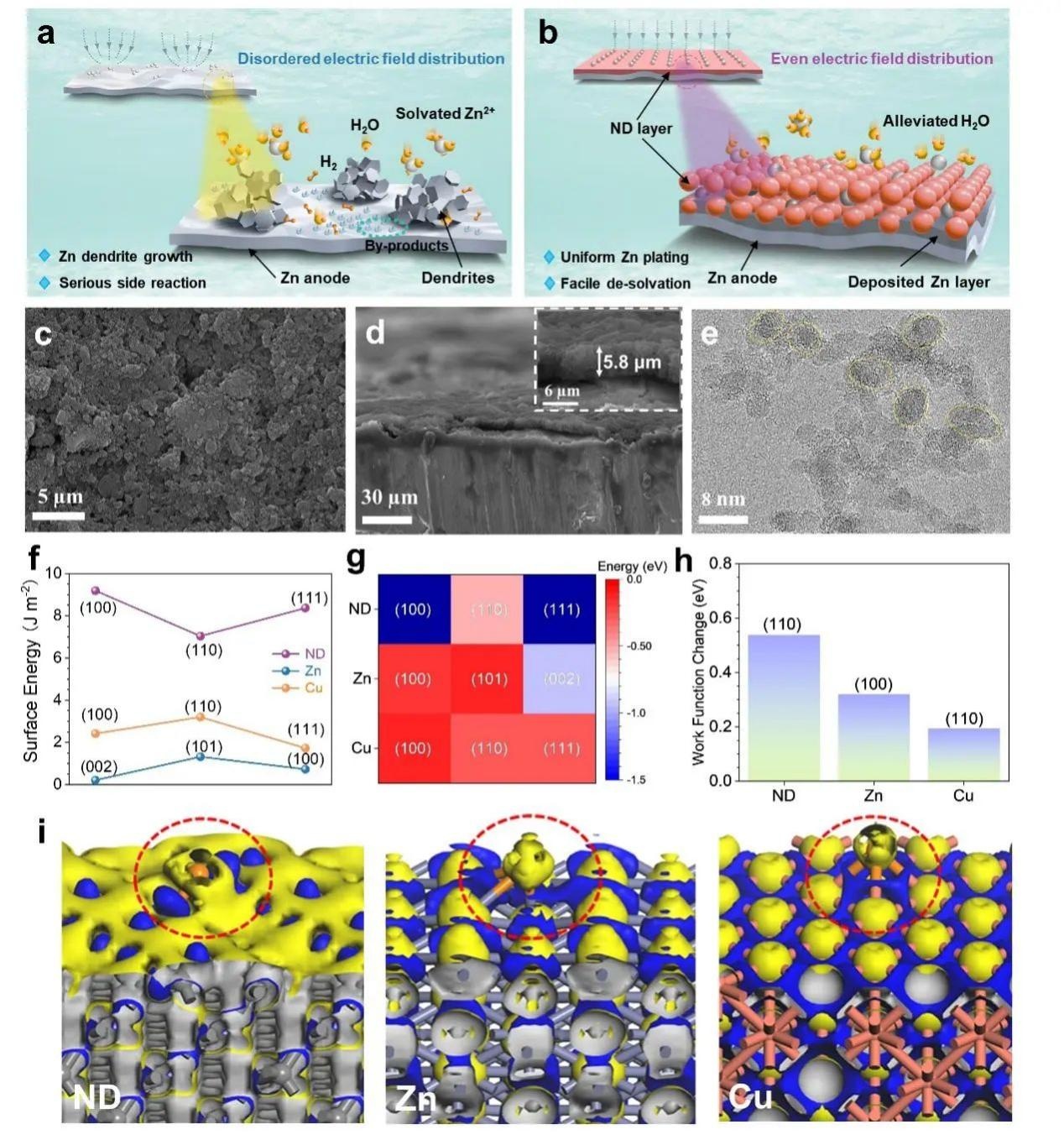 中國粉體網訊 近期,香港城市大學的張文軍教授和洪果教授攜手香港理工大學的黃渤龍教授共同展開合作,精心設計并成功制備出一種多功能納米金剛石保護涂層。該涂層在水系鋅離子電池中,對鋅枝晶的生長以及析氫反應起到了顯著的抑制作用,充分展現出極為優異的循環穩定性。相關成果以“Multifunctional Nanodiamond Interfacial Layer for Ultra-Stable Zinc-Metal Anodes”為題發表在Advanced Energy Materials 期刊上。