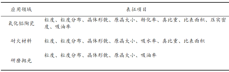 理論上產品要達到質量完全一致,粉體的各項性能指標也必須相同,但是在α-Al2O3的實際生產和應用中,大部分情況下并不需要對所有表征項目進行分析檢測,不同用戶在不同條件下所要求的表征項目也不相同,根據經驗只需分析幾個關鍵指標即可。α-Al2O3主要有三大典型應用領域:陶瓷、耐火材料和研磨拋光,不同用途對α-Al2O3性能的要求和表征內容也不相同。