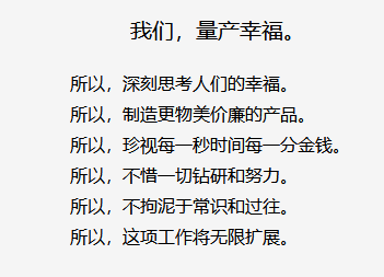 談到“偉大企業”,我查閱了它的企業愿景和使命,與“量產幸福”的豐田相比,我總感覺“偉大企業”缺少了點不可言說的東西,而這點東西好像又決定了人與機器的本質區別。