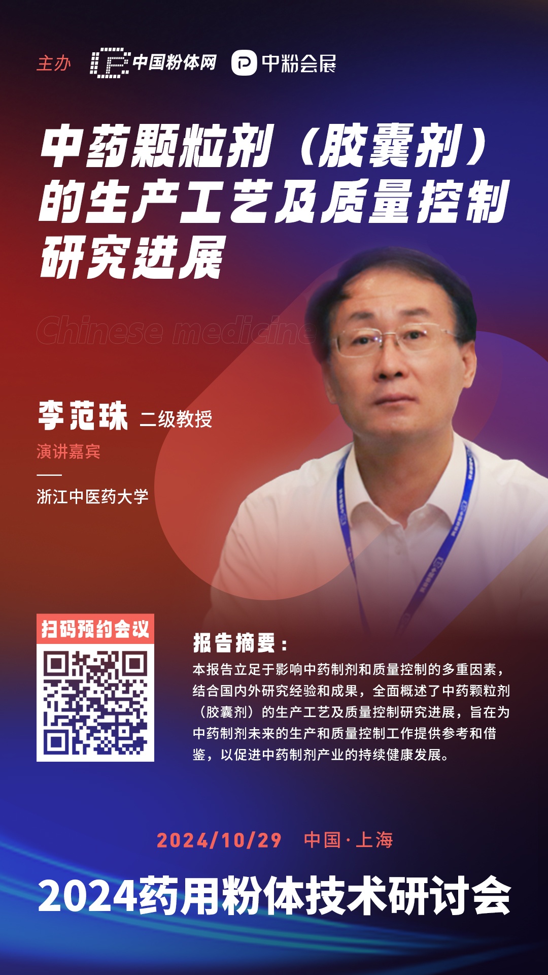 2024年10月29-31日在上海跨國采購會展中心,由北京粉體技術協會與柏德英思展覽(上海)有限公司聯合主辦2024藥用粉體技術研討會。屆時來自浙江中醫藥大學李范珠教授將為大家帶來《中藥顆粒劑(膠囊劑)的生產工藝及質量控制研究進展》的主題報告。本報告立足于影響中藥制劑和質量控制的多重因素,結合國內外研究經驗和成果,將全面概述中藥顆粒劑(膠囊劑)的生產工藝及質量控制研究進展,旨在為中藥制劑未來的生產和質量控制工作提供參考和借鑒,以促進中藥制劑產業的持續健康發展。