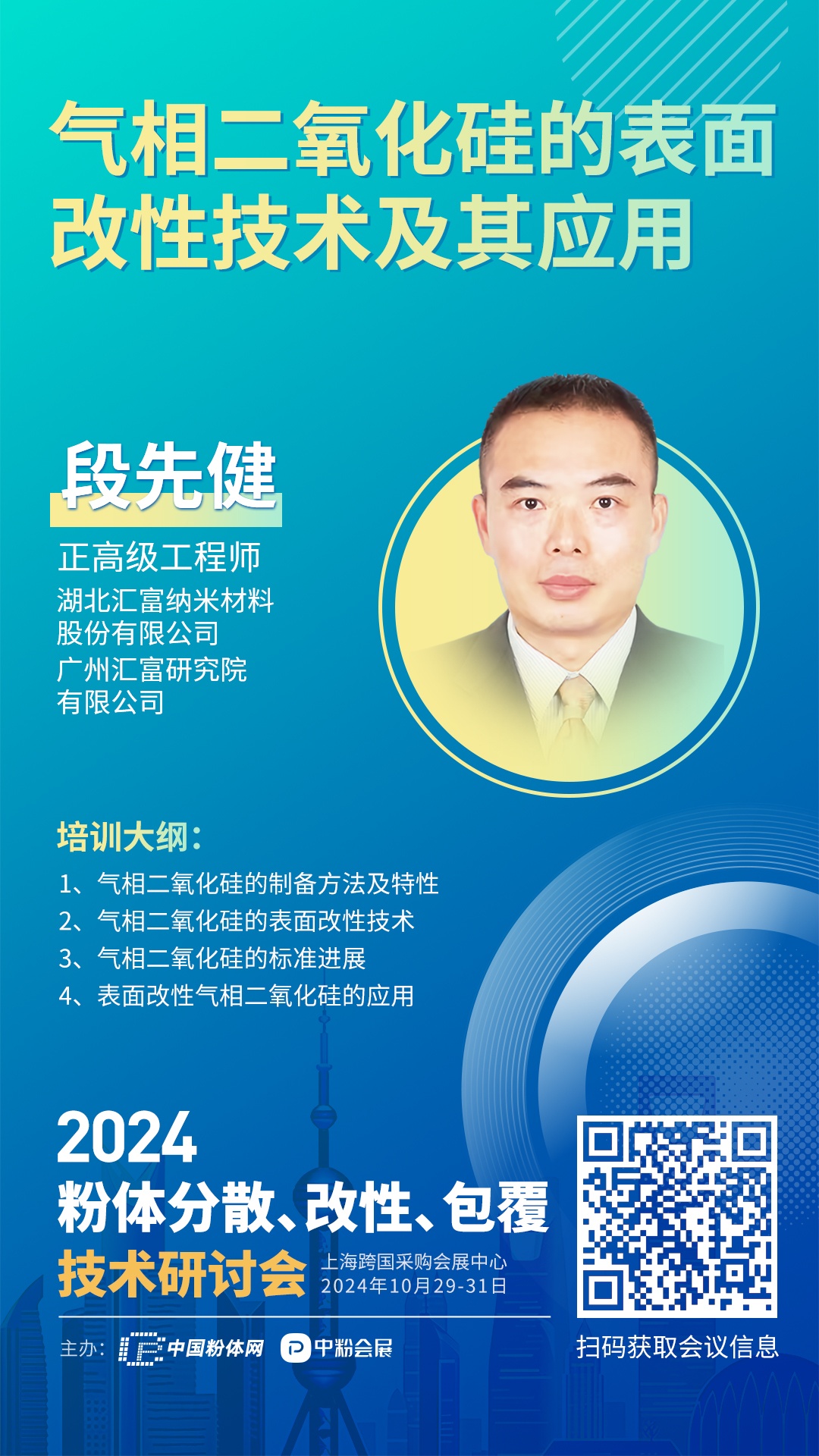2024年10月30日在上海跨國采購會展中心,由北京粉體技術協會與柏德英思展覽(上海)有限公司聯合主辦“2024粉體分散、改性、包覆技術研討會”。屆時廣州匯富研究院有限公司正高級工程師段先健作《氣相二氧化硅的表面改性技術及其應用》報告,為參會嘉賓講解氣相二氧化硅的制備方法及特性、表面改性技術、標準進展及應用等一系列內容。